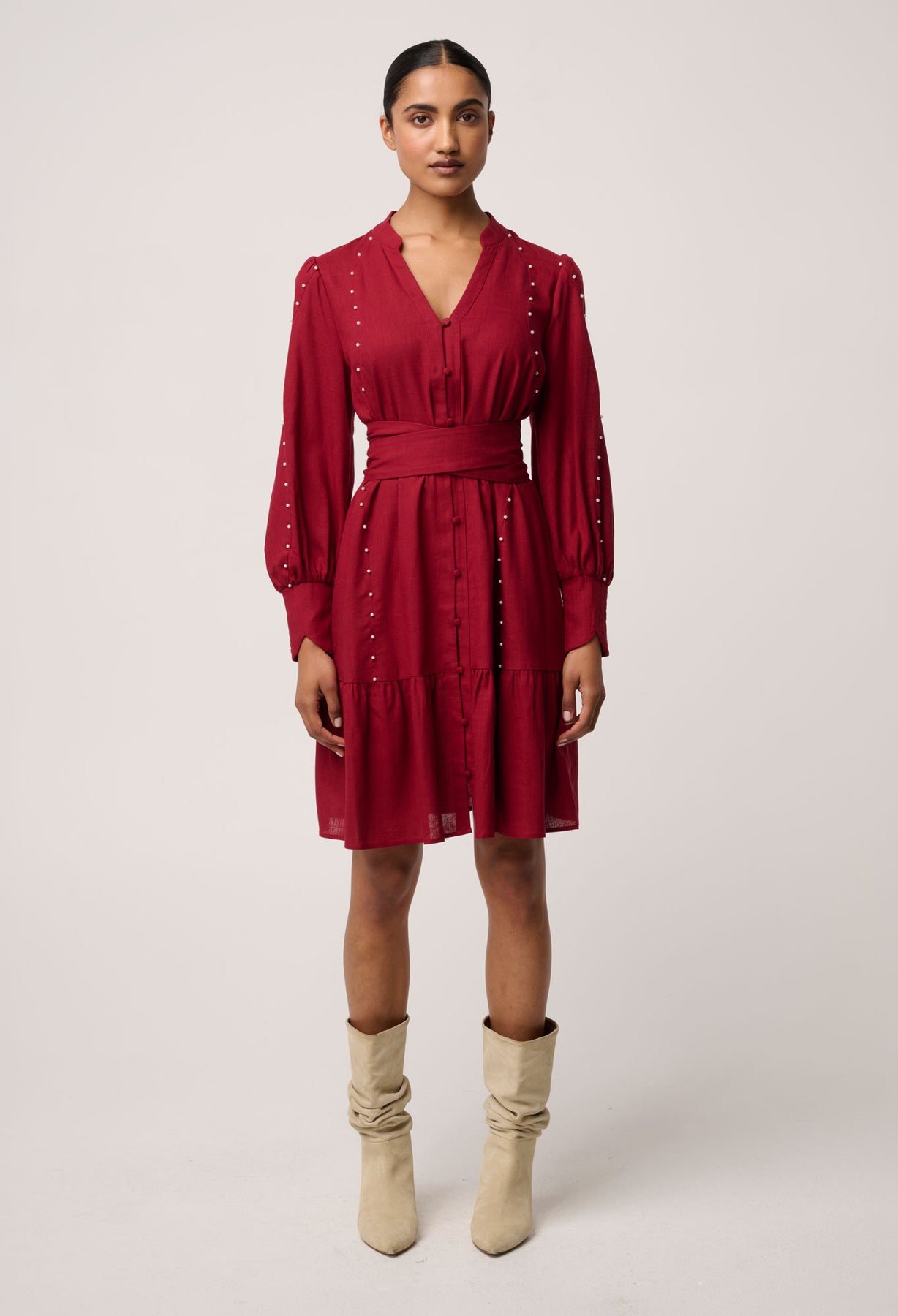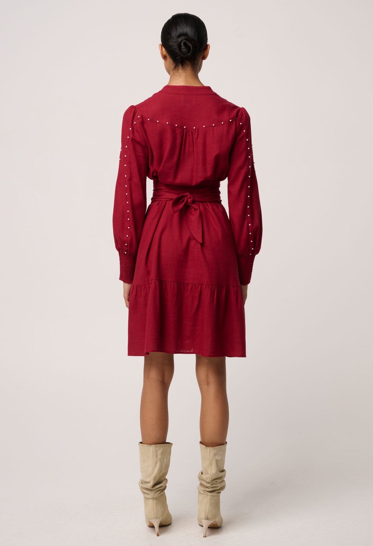Step into refined femininity with the Cecilia Pearl Embellished Linen Blend Dress in Ruby, a beautifully crafted piece that combines effortless elegance with delicate detailing. Made from a breathable linen blend, this dress offers a lightweight, airy feel while maintaining a soft, structured silhouette. The rich ruby hue adds depth and sophistication, while subtle pearl embellishments delicately trace the bodice and skirt, creating a refined, eye-catching finish. Designed with a flattering cinched waist and coordinating tie belt, it enhances the figure while the softly gathered skirt adds graceful movement. Perfect for both daytime occasions and elevated evening styling, this dress is a timeless addition to any modern wardrobe.