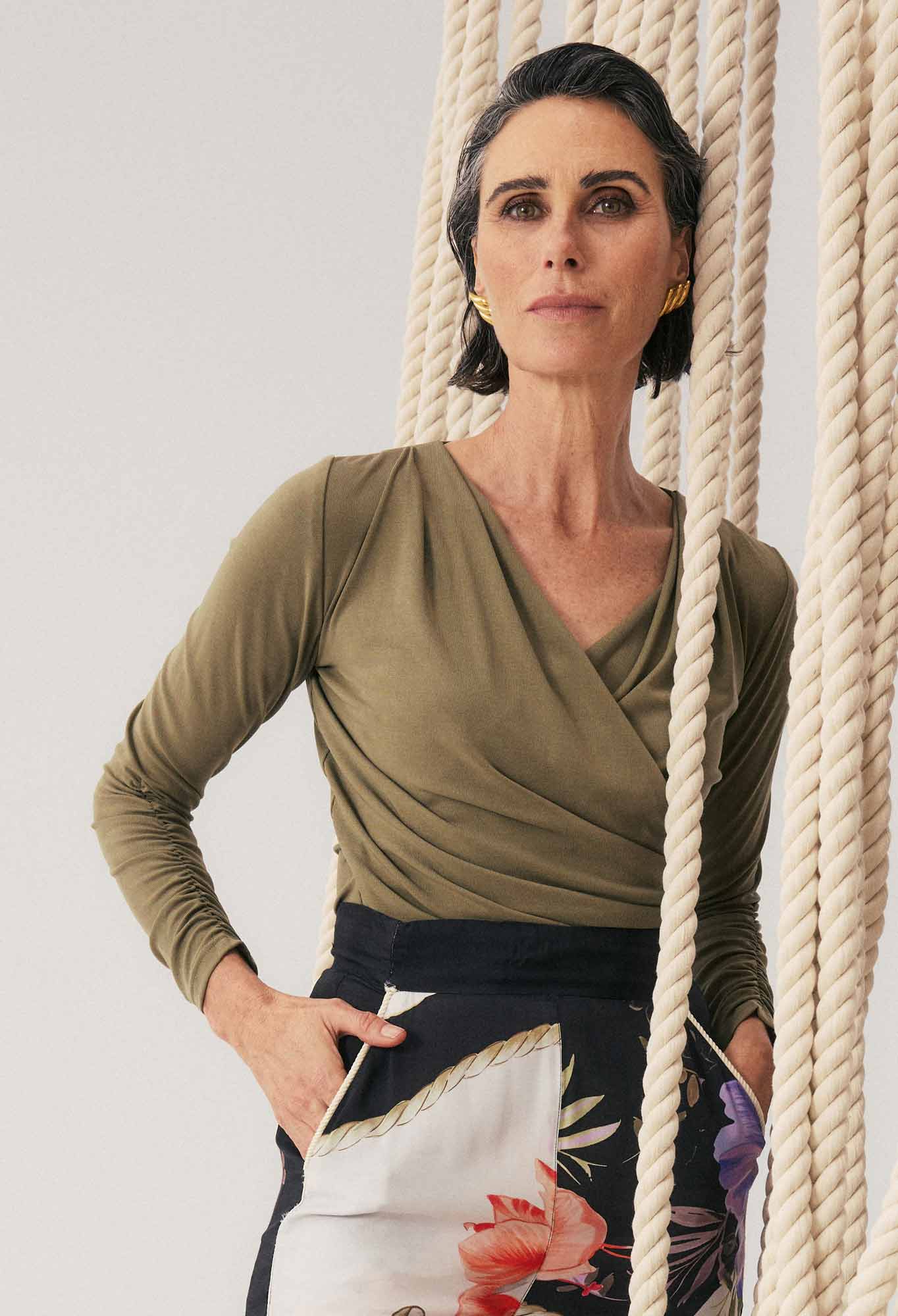 Effortlessly flattering and beautifully versatile, the Aster Lyocell Stretch Wrap Top in Dusty Olive is a modern essential designed to complement every wardrobe.