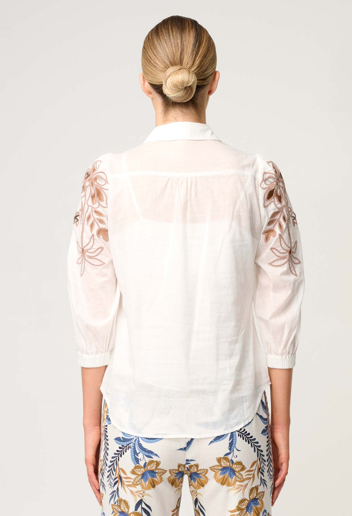 Elevate your wardrobe with the timeless elegance of the Callisto Cotton Embroidered Shirt in Ivory-Dune. Crafted from lightweight, breathable cotton, this statement shirt combines effortless sophistication with modern femininity. The standout feature lies in its intricately embroidered sheer sleeves, showcasing dune-toned floral motifs that add depth and texture to a classic silhouette.