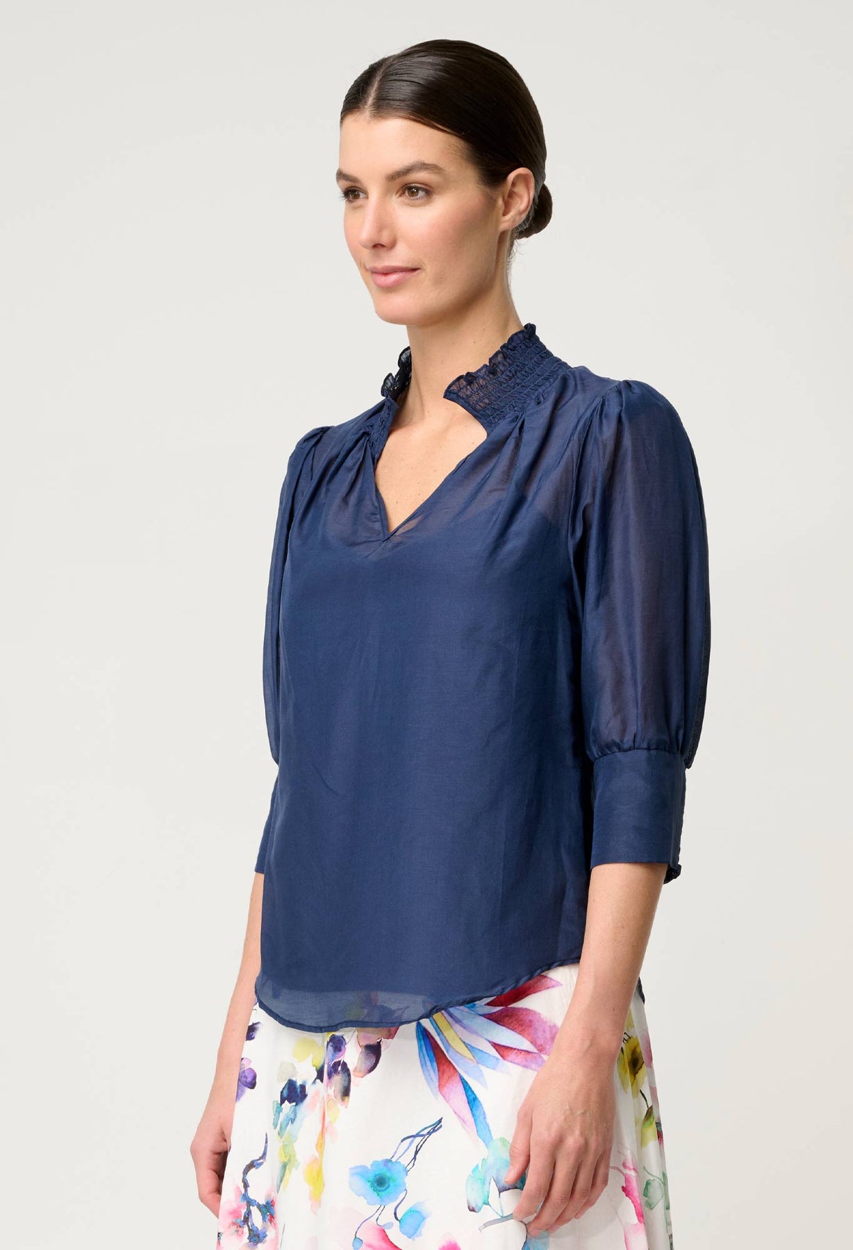 The shimmering Midnight Blue hue adds timeless depth, while the shirred high collar and gently gathered shoulders create a romantic silhouette. Featuring semi-sheer sleeves with structured cuffs and a flattering V-neckline, the Penelope Blouse effortlessly balances classic tailoring with relaxed ease.