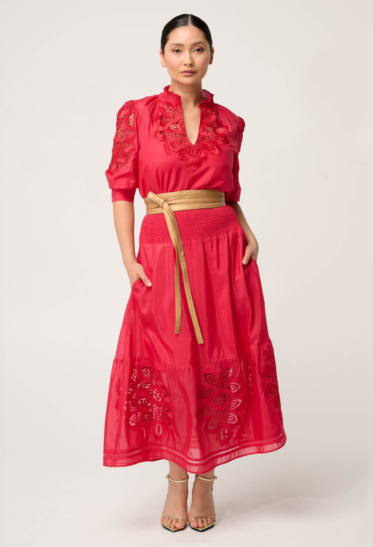 Petite Cordelia Shirred Waist Silk Cotton Skirt in Ruby